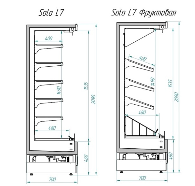 Различные типоразмеры SOLO L7 (1250, 1500, 1875 и 2500 мм) делают ее универсальной для магазинов различных площадей – от небольших магазинов формата «у дома» или «экспресс» до сетевых гипермаркетов. Компактное исполнение холодильной горки (глубина 700 мм) позволяет организовать эргономичную расстановку оборудования в торговом зале. Для возможности эффективной демонстрации овощей и фруктов разработан специальный «фруктовый комплект» (дополнительная опция).